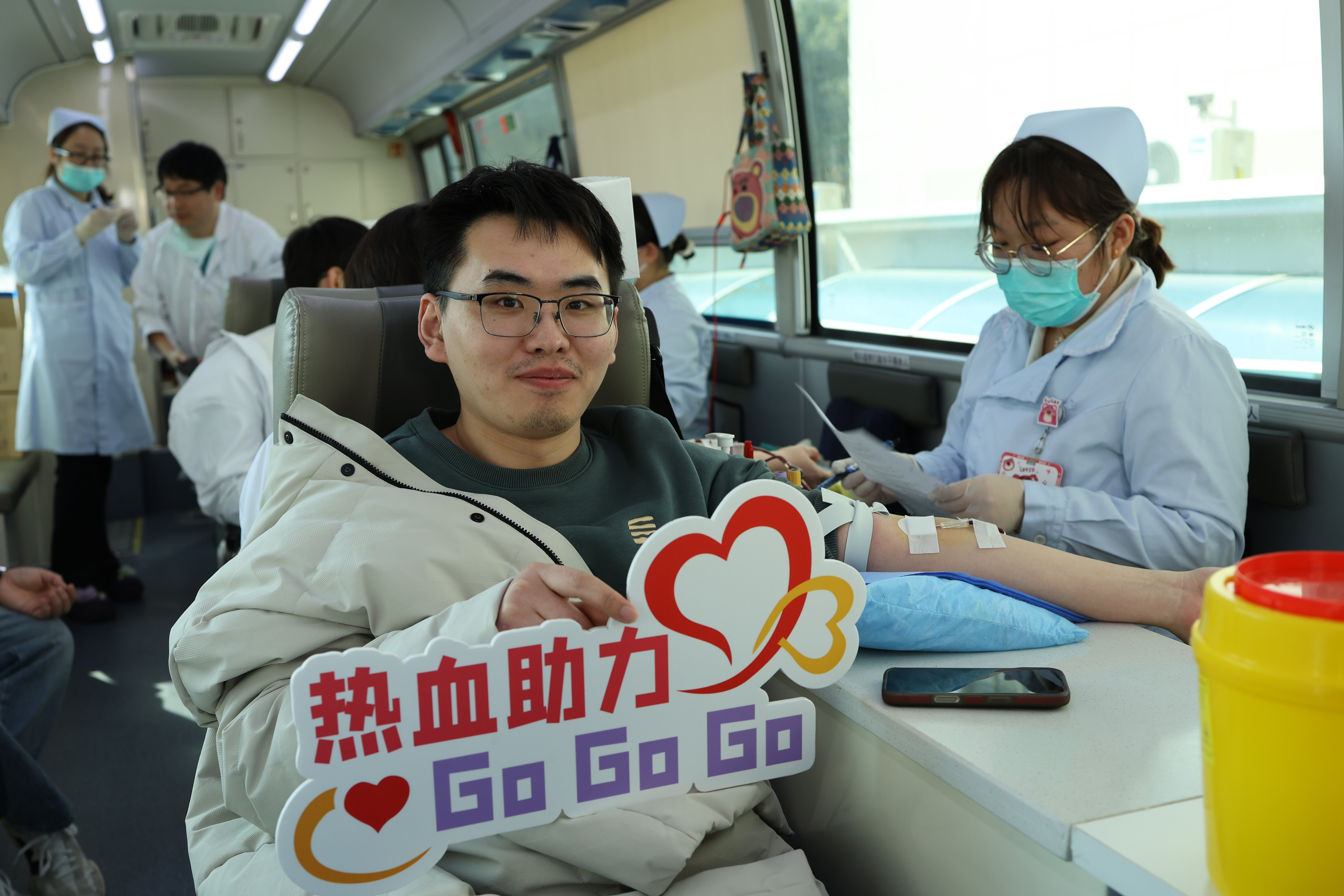 献血车内,医护人员和志愿者们配合紧密,为献血者提供温馨周全的服务,确保每一位献血者都能在安全、舒适的环境中完成献血。同时,他们耐心地解答着献血者的疑问并反复强调献血后的注意事项。