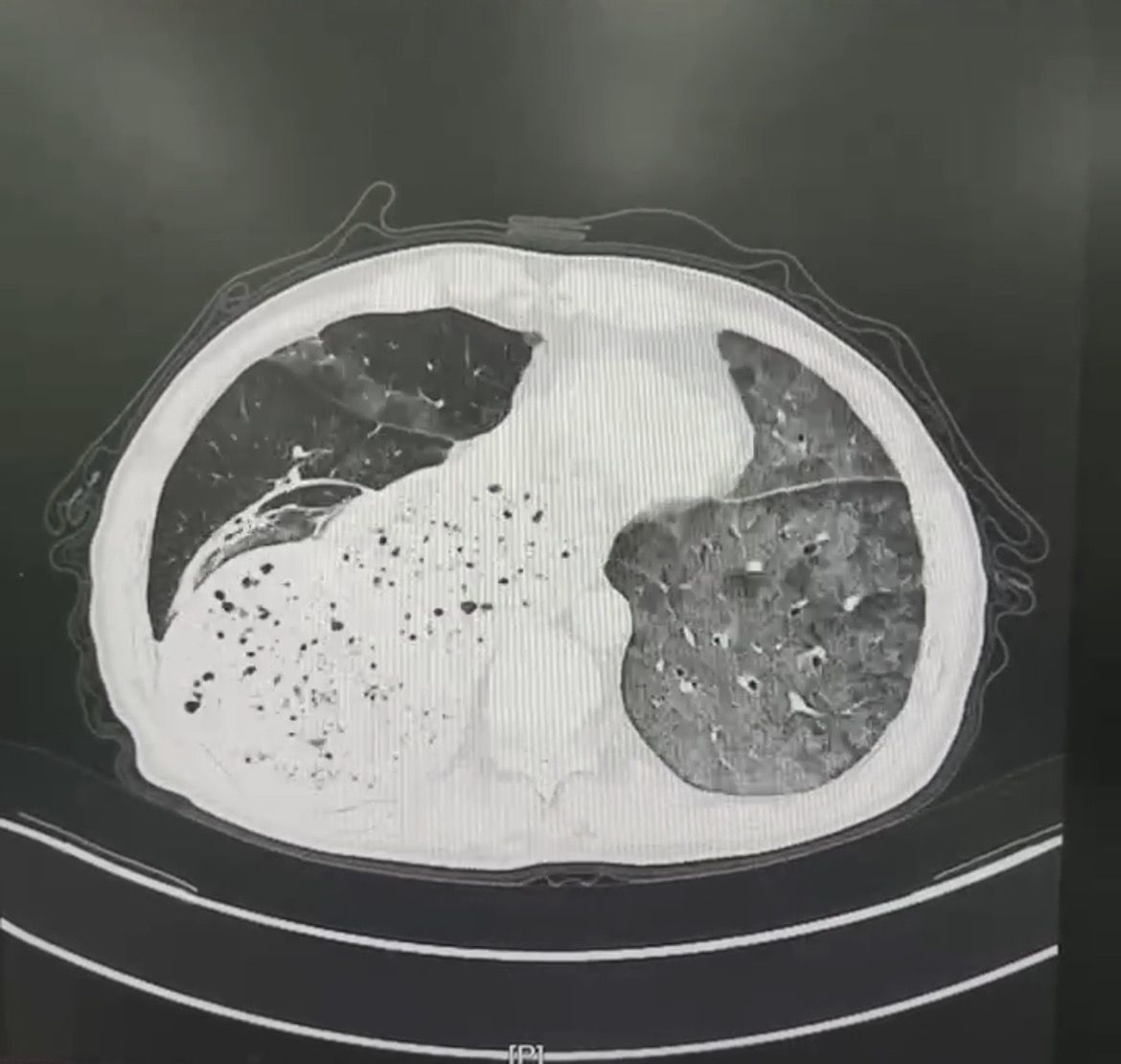 患者赵先生,反复的胸闷、呼吸困难一年有余,每一次呼吸都成为一种负担。随着时间推移,病情逐渐恶化,平静休息时难以缓解,活动后症状加剧。赵先生曾辗转多家医院就诊,然而疾病始终诊断不明,治疗效果不佳,病情时有反复,令患者和家属备受煎熬。近期,患者的病情急转直下,胸闷气急加重,甚至出现呼吸衰竭。门诊胸部CT提示两肺弥漫性渗出病变,紧急收入我院。
