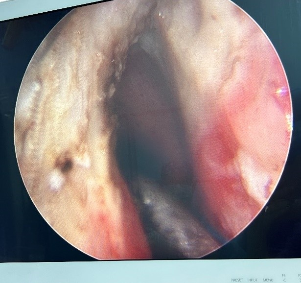 手术室内,气氛紧张而凝重。当支气管镜顺利进入,眼前的景象令人揪心:声门处管腔狭窄程度高达95%,巨大的白色肿物如同巨石般堵塞其中,表面光滑却质地坚硬。医疗团队沉着应对,先予圈套器多次圈套电切治疗,同时进行活检,样本送检常规病理。在精细操作下,声门得以部分暴露。在李健主任带领下的麻醉团队支持配合下,气管插管辅助通气。后续耳鼻喉科宋升桥主任凭借其深厚的专业功底,在支撑喉内镜下行喉部肿瘤等离子切除术。每一次操作都精准无误,每一个步骤都紧密衔接。在团队的共同努力下,肿物被逐步、分段切除,声带及喉室得以充分暴露,术后喉空间完全开放,管腔恢复通畅,如同被疏通的河道,重新恢复了生机,同时,凭借团队精湛的医术与充分完善的术前准备,避免气管切开带来的痛苦。术中患者生命体征始终保持稳定,术后患者呼吸明显顺畅,当晚便酣然入睡,目前患者正在住院恢复当中。
