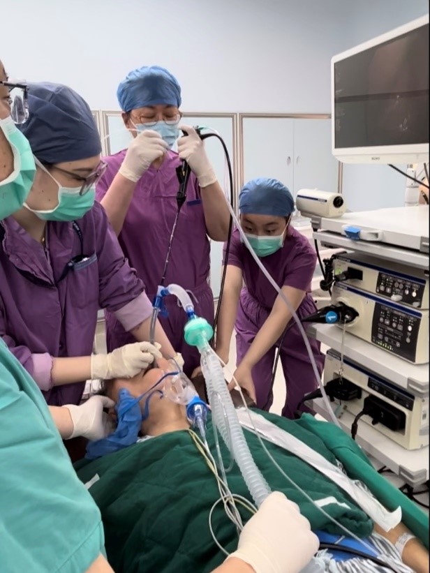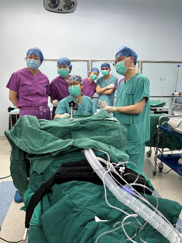 患者声门处的巨大肿物如同高悬的达摩克利斯之剑,随时可能引发呼吸困难,危及生命。蒋军红主任带领下的医疗团队迅速启动多学科协作机制,团队成员争分夺秒地推进术前准备工作,紧急邀请耳鼻喉科宋升桥主任医师、麻醉科李健主任医师协同开展联合诊疗。多学科专家凭借深厚的专业积淀,从患者心肺功能储备、肿物血运分布及毗邻组织关系、气道管理风险等多维度展开全面且精细的术前评估,围绕每一种可能出现的情况深入研讨,迅速且细致地做好气管切开准备,确保在关键时刻能够迅速、高效开展操作。并制定出一套精准而周密的治疗方案:首先选择喉罩全麻但需保留自主呼吸的情况下行支气管镜检查,切除一部分肿瘤组织,为气管插管奠定条件。