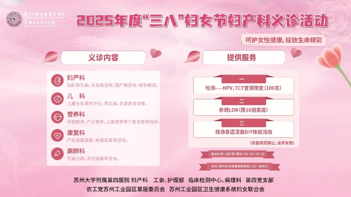 在苏大附四院工会及第四党支部的支持下,呵护女性健康,绽放生命精彩主题三八妇女节义诊活动37日于医院门诊大厅顺利举办。本次活动由妇产科牵头,联合儿科、麻醉科、营养科、康复科等多科室共同参与,旨在为广大女性朋友提供全方位的健康服务,传递苏大附四院对市民健康的深切关怀。