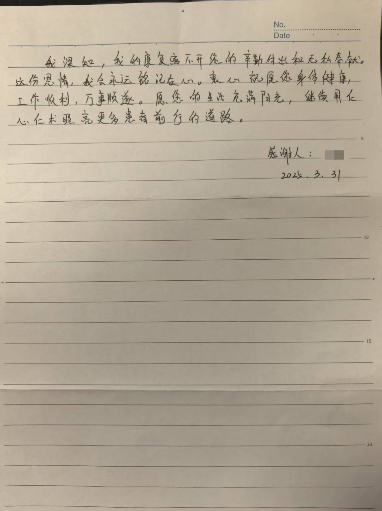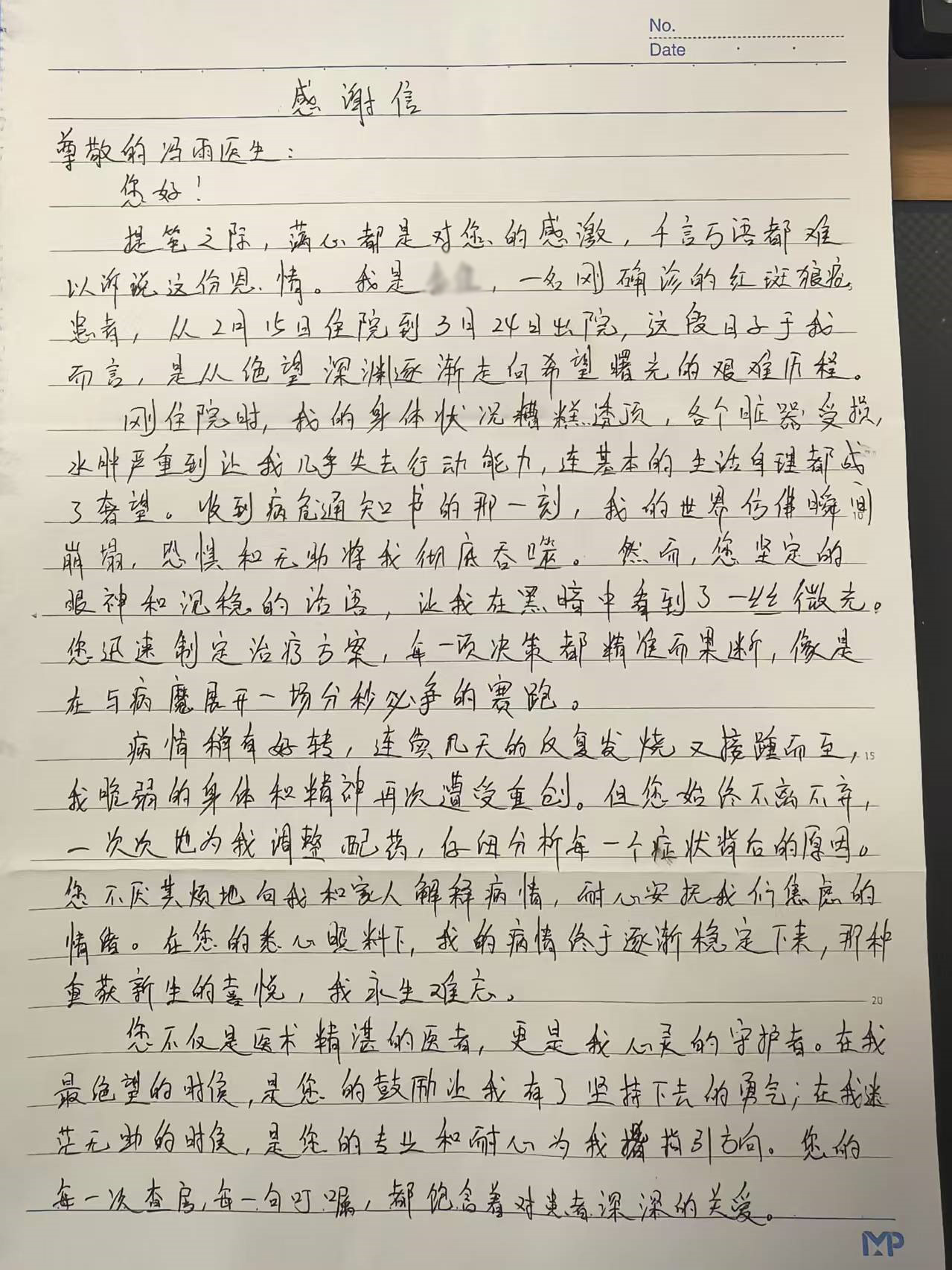 一封致我院风湿免疫科冯雨医生的感谢信