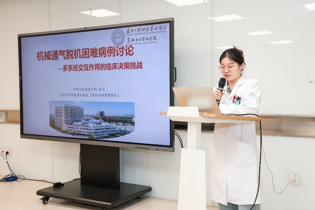 随后,由苏大附四院张洁医师带来一例极具临床指导价值的“气管切开困难脱机”病例分享。患者因咳嗽咳痰伴气促在外院被确诊为重症肺炎、ARDS等多种复杂病症,曾经历了气管切开呼吸机辅助治疗达2个月,但治疗效果不佳。苏大附四院借助多学科协作的强大力量,多维度深入剖析脱机困难的原因,最终发现患者有周围神经病变和COPD/VAP等情况,并对发现的问题展开了一系列针对性治疗:调整抗感染方案、运用丙球和甲强龙治疗周围神经病变、开展康复锻炼以及实施渐进性脱机锻炼等措施。最终,患者病情好转出院。这一病例充分体现了多系统交互作用在临床决策中的复杂性,为参会者提供了宝贵的实战经验。