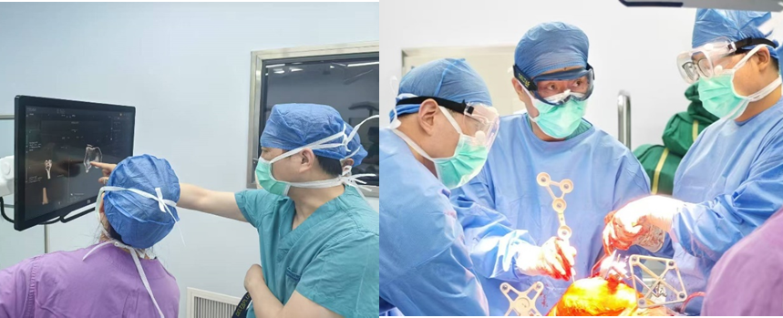 经过详尽的术前检查,姜为民主任与杨小海主任等关节外科专家讨论后决定采用目前更为先进的机器人辅助关节置换术。手术在姜为民主任的指导下由杨小海主任医师主刀。杨主任专注耕耘关节置换与运动医学领域20余年,擅长髋、膝、肩关节置换及关节镜微创技术,曾率先开展院内首例肩关节置换与微创肩关节盂唇修复手术。与传统的关节置换手术不同,机器人辅助手术需要先行标识与注册,再规划,然后根据规划的路径进行精准的截骨。