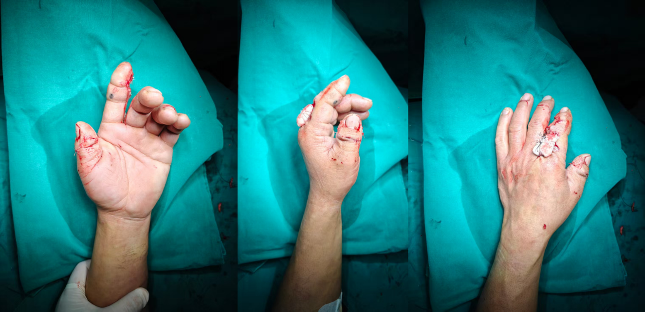 术后苏大附四院医疗团队为患者制定“四防一促”管理方案:防血管危象、防感染、防血栓、防关节僵直、促神经再生。通过毛细血管反流监测、定制化抗凝方案及早期康复介入,患者再植指体顺利度过72小时血管危象高发期。目前,患者拇指及食指末梢血运良好,创口已愈合,提示再植的拇指及食指皮瓣存活。