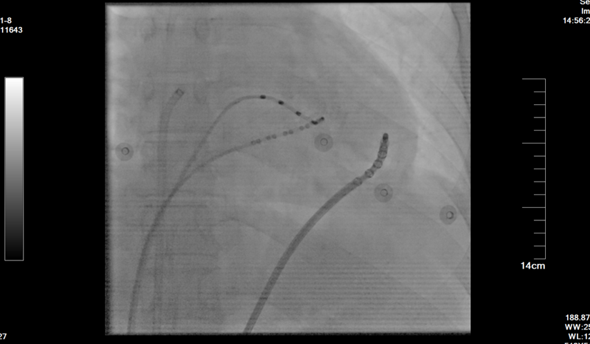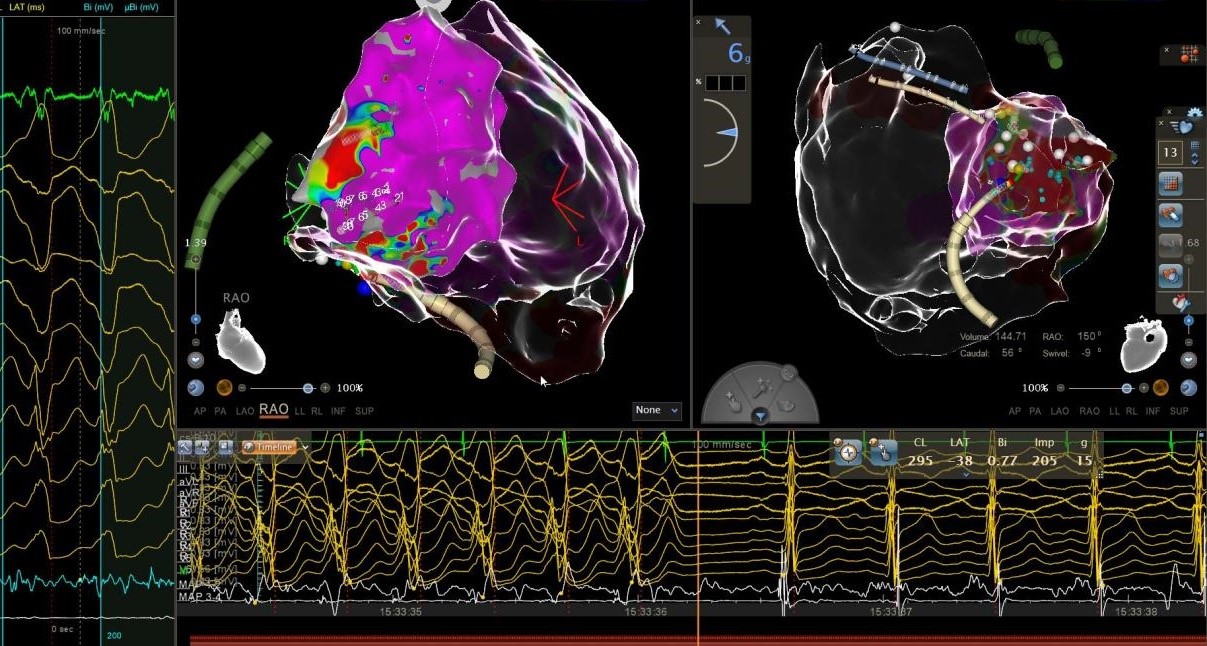 面对这一挑战,在学科带头人周亚峰教授的指导下,陈弹主任医师、王林林教授带领心内科电生理团队共同制定了三维电解剖标测联合心内外膜基质改良的手术方案。手术由王林林教授主导进行,术中通过双侧股静脉入路,精准构建右心室三维模型,标测出右心室下壁广泛低电压区。团队突破性采用干性心包穿刺技术,成功进入心外膜空间,术中采用高功率盐水灌注消融,消融后室速实时终止,并对心内膜、心外膜低电压区进行基质改良。经反复程序刺激验证,室速不再被诱发。术后患者恢复良好,未再出现室速发作,心悸症状完全缓解。相较于传统ICD植入的被动防御,射频消融术通过主动消除心律失常基质,显著降低年轻患者的猝死风险及器械依赖,为其重返正常生活提供可能。