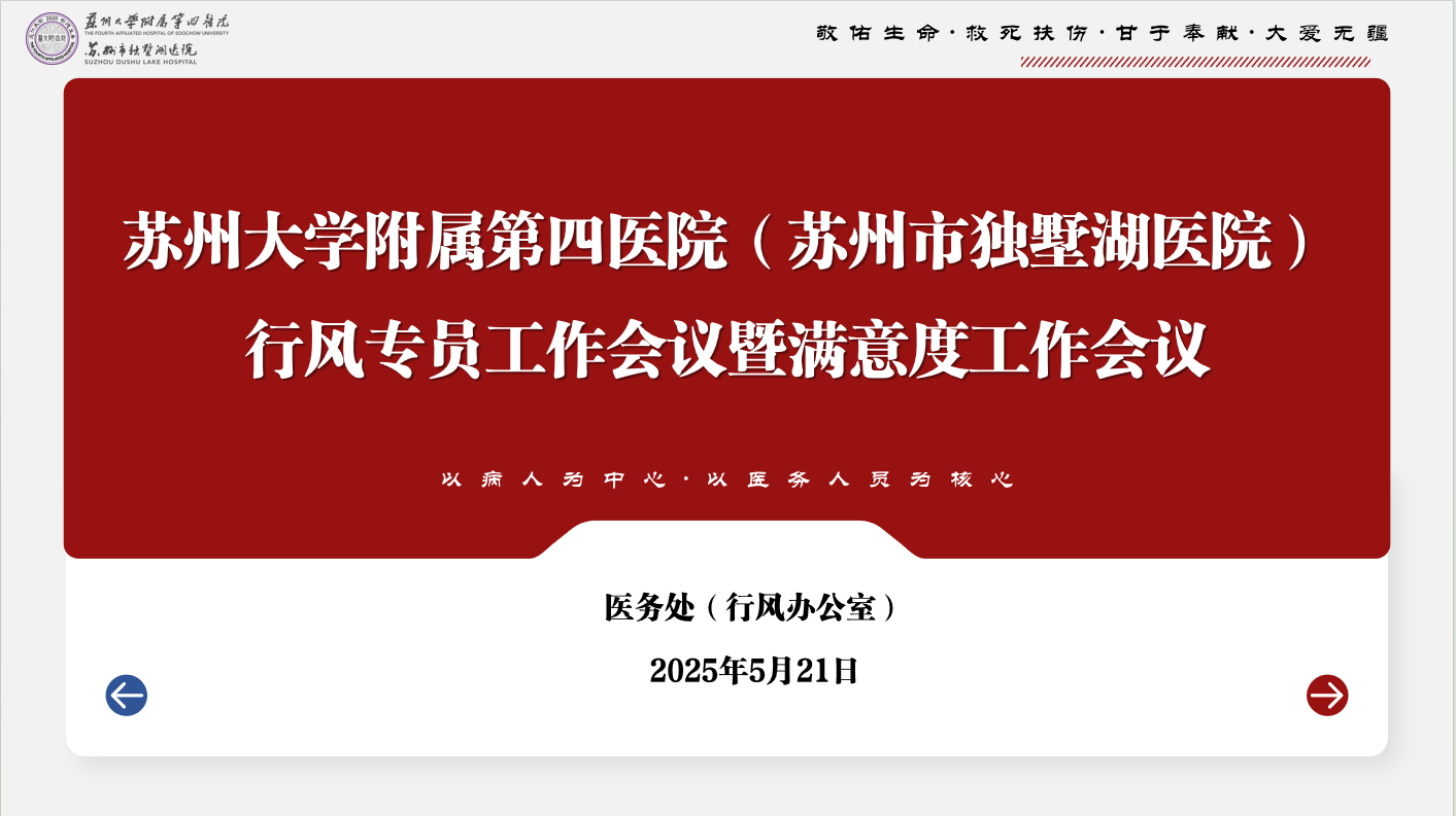 5月21日,苏州大学附属第四医院组织召开行风专员工作会议暨满意度工作会议,旨在深化行风建设、优化医疗服务、提升患者与职工满意度。全体行风专员及职能部门相关工作人员共同参会。