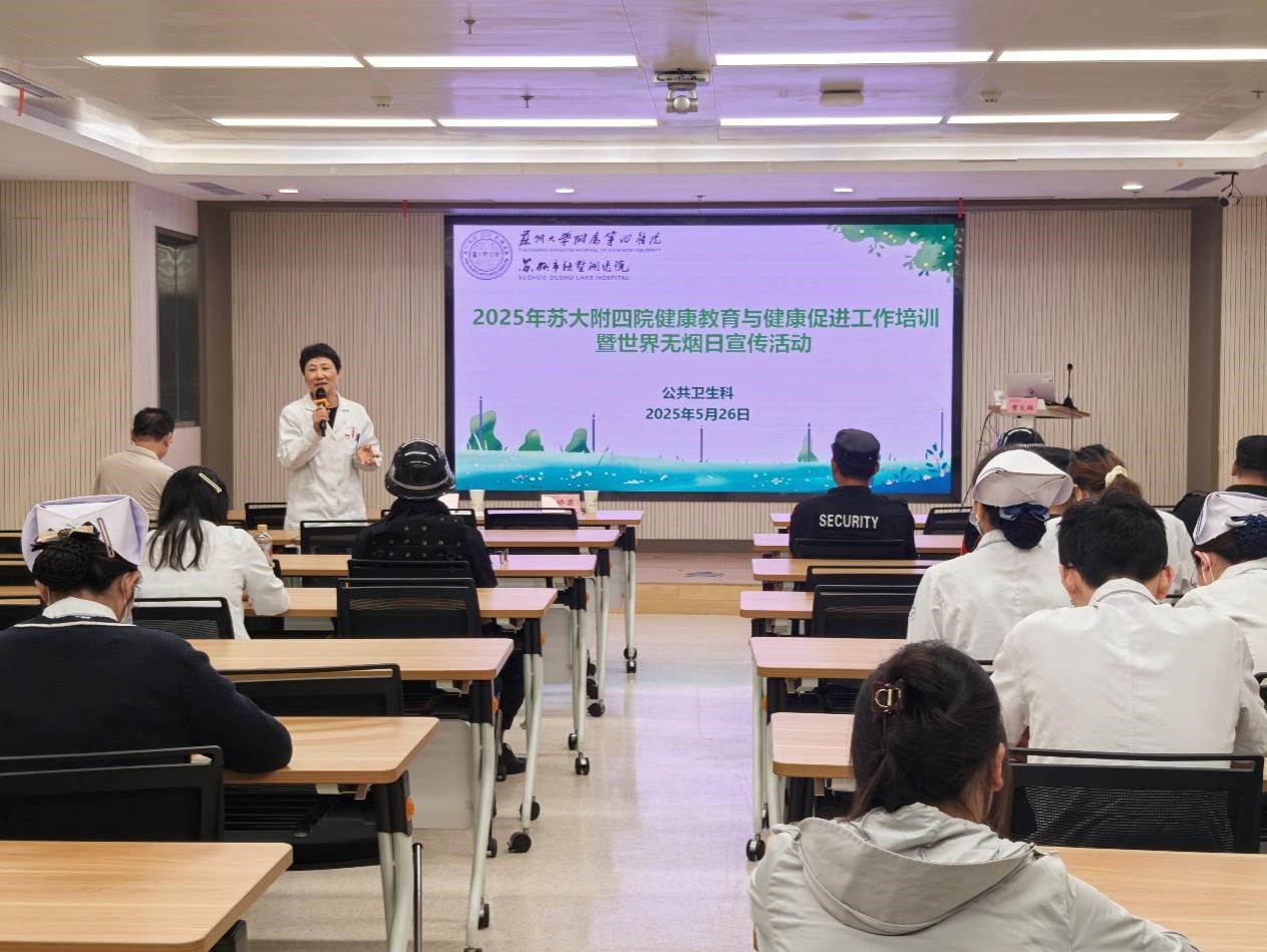 在第38个“5・31世界无烟日”到来之际,为深入贯彻落实《健康中国行动(2019-2030年)》相关要求,进一步强化医院健康知识普及职能,推进健康促进医院建设,全力营造无烟健康环境,5月26日,苏州大学附属第四医院公共卫生科组织开展了健康教育与健康促进工作培训暨世界无烟日宣传活动。各临床、医技行政职能科室成员及医院后勤人员参与此次活动。公共卫生科负责人王秀珍主持此次活动。