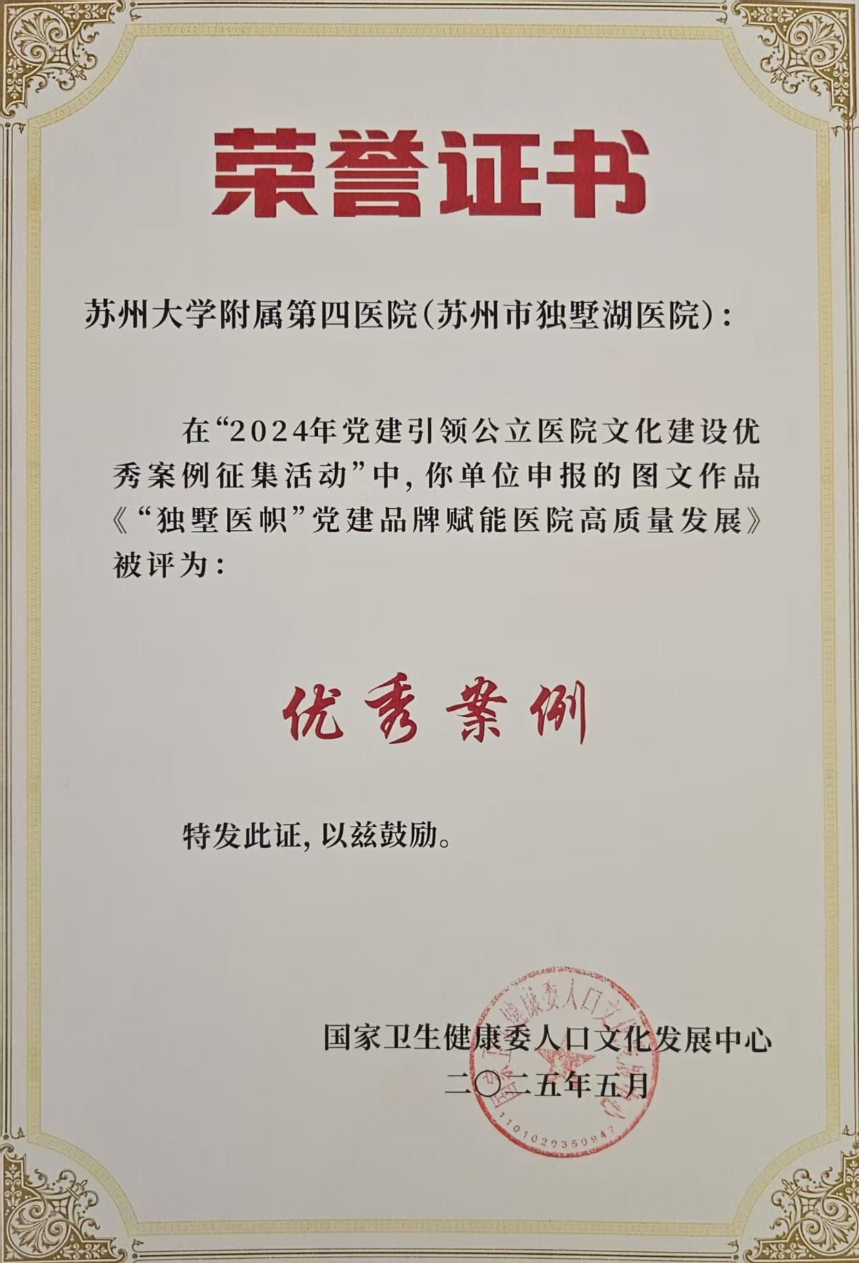 近日,由国家卫生健康委人口文化发展中心主办、中国卫生健康思想政治工作促进会支持的“2024年党建引领公立医院文化建设经验交流活动”顺利举行。苏州大学附属第四医院(苏州市独墅湖医院)报送的《“独墅医帜”党建品牌赋能医院高质量发展》被评为优秀案例。