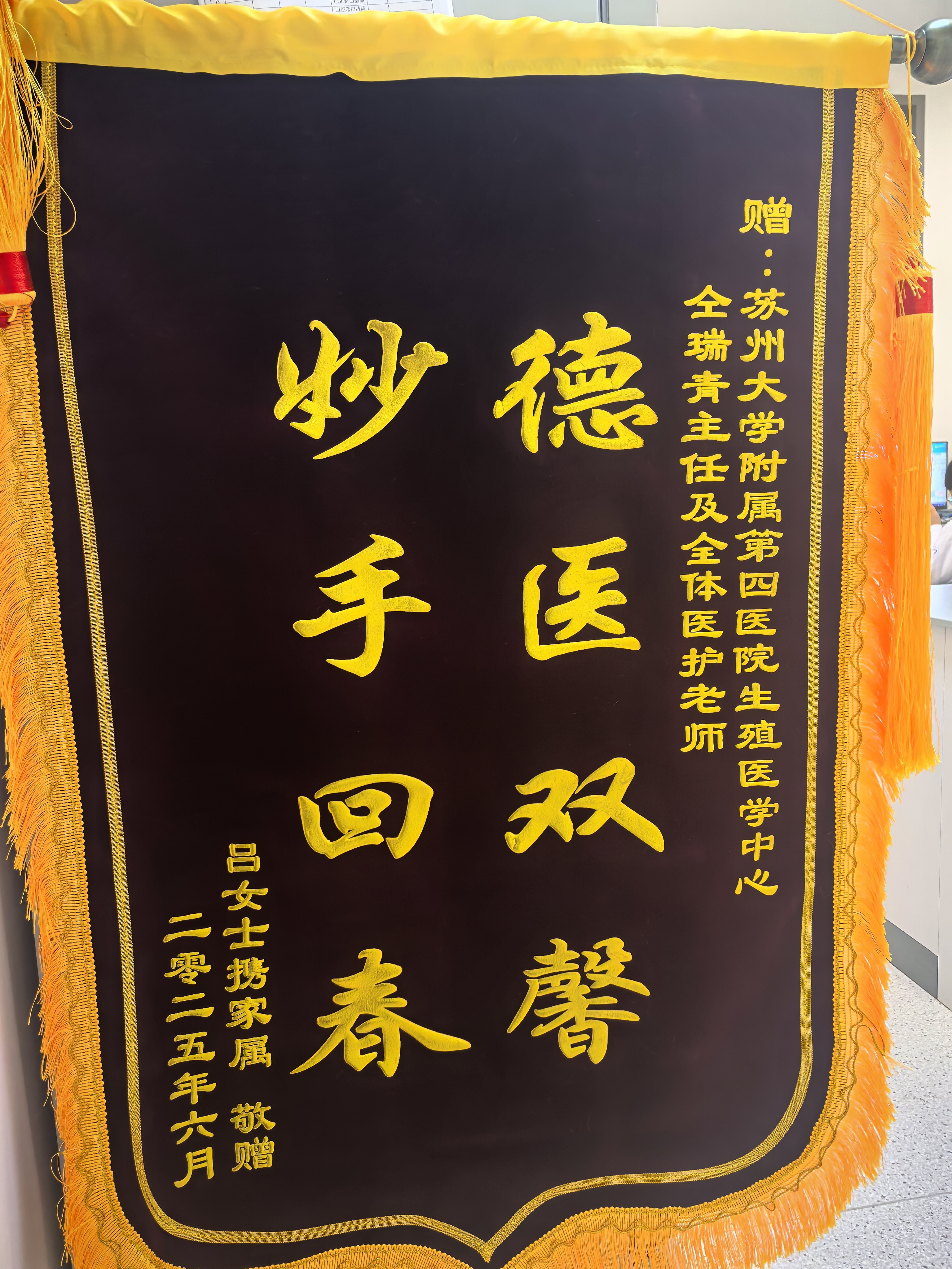 患者吕女士携家属赠送锦旗感谢我院生殖医学中心仝瑞青副主任医师及全体医护人员