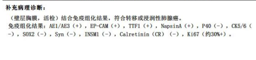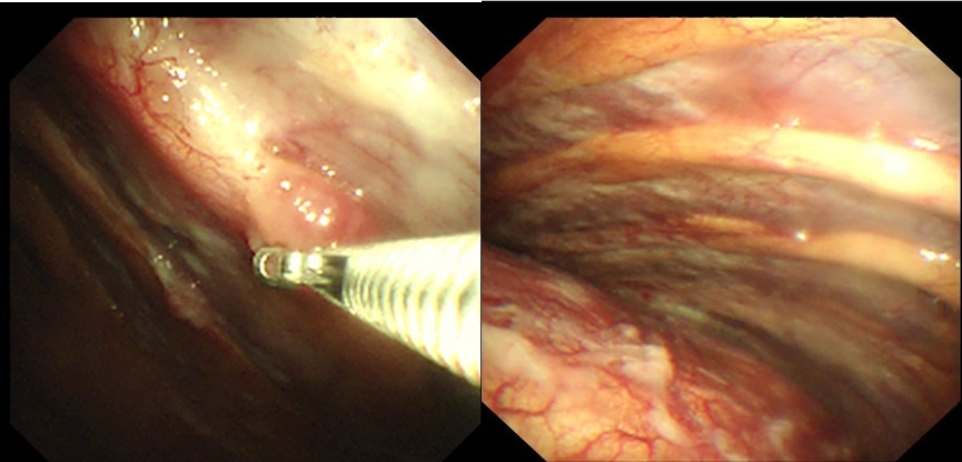 手术当日,患者左侧卧位,采用局麻方式,经超声精准定位后,于右侧腋中线5-6肋间进行人工气胸操作,内科胸腔镜直视下,可观察到壁层胸膜和脏层胸膜,实时活检。既明确诊断,又确认了分期,术后患者恢复良好。