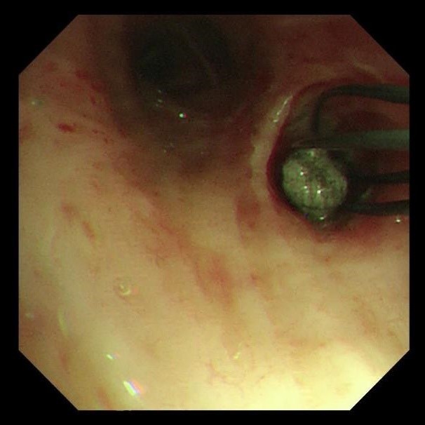 两天后复查支气管镜,发现患者左下叶背段远端细支气管仍有残留泥沙样异物。团队采用超细支气管镜联合冷冻技术,通过冷冻探头将异物凝固,再用超细活检钳逐支清理,实现对远端气道的彻底清理,实现气道“零死角”。