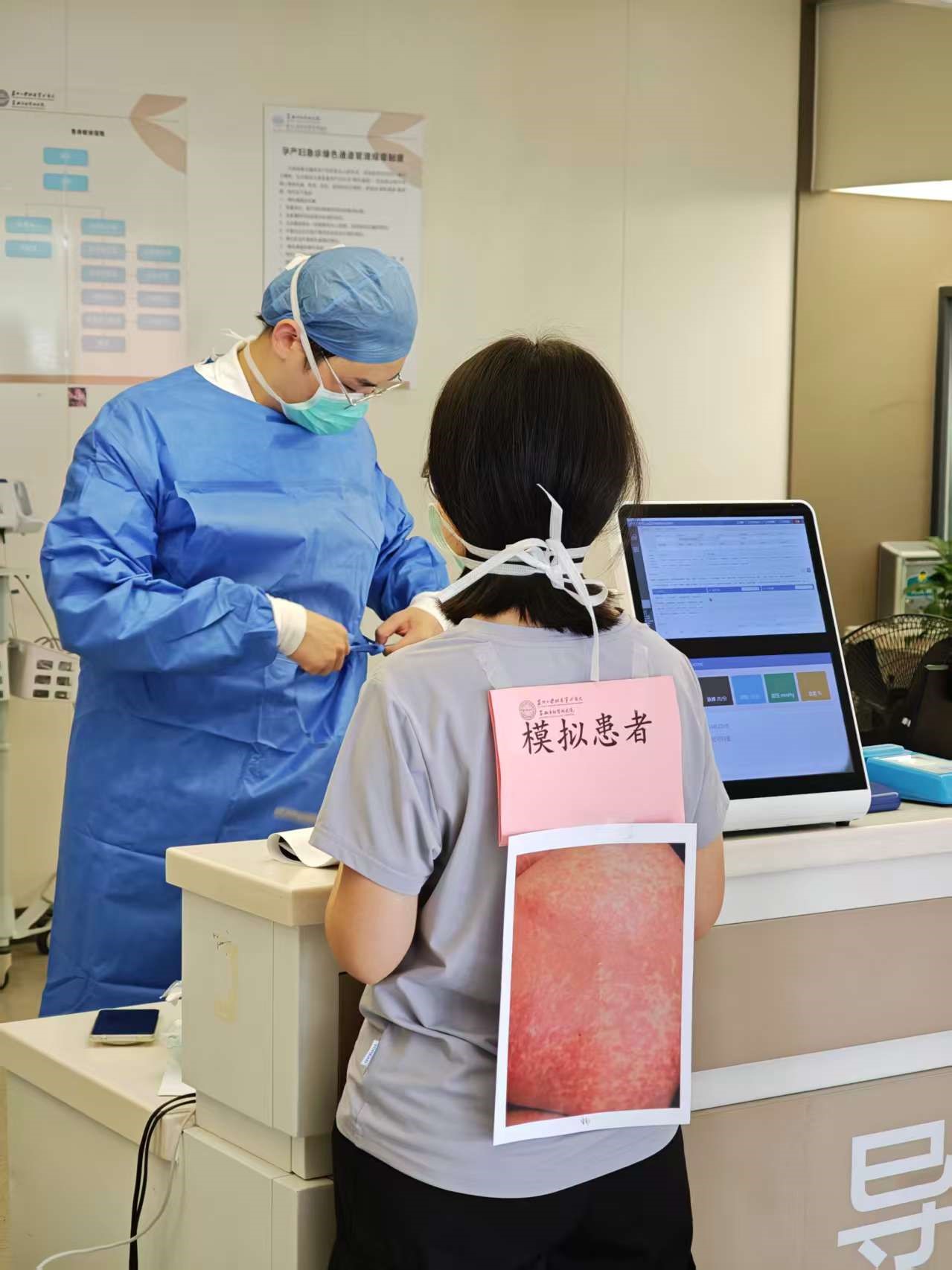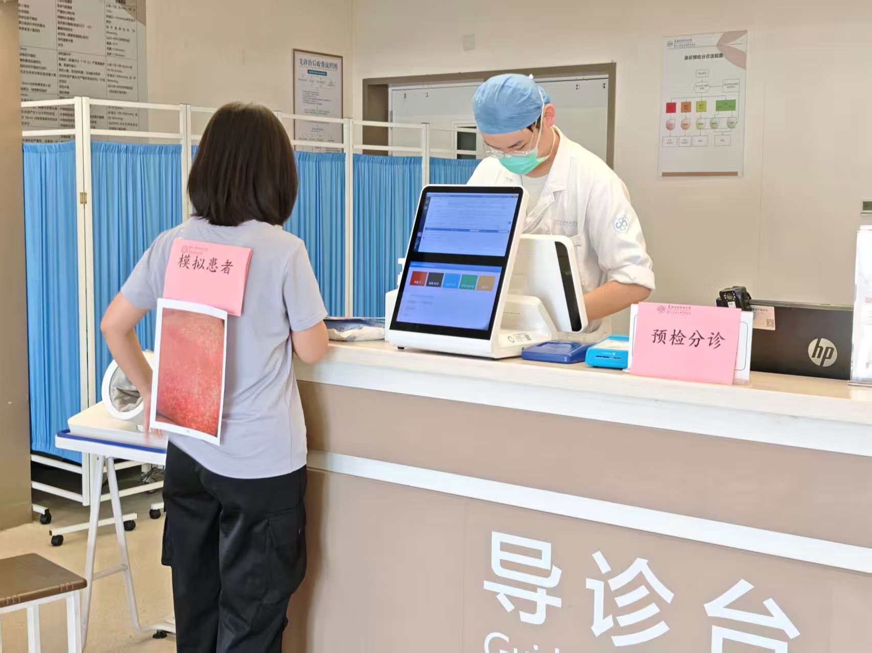 实战演练部分,预检分诊环节率先发力,快速识别准确分诊,在急诊预检分诊台快速启动筛查程序,准确识别“高热伴红斑皮疹”模拟患者,并引导其经专用通道避开人群,安全转移至发热门诊诊室。接诊、隔离、报告环环相扣,多个部门高效协同。