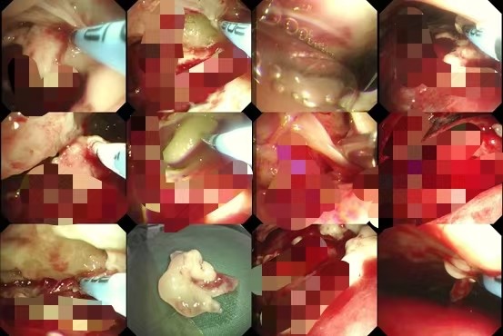 随后,蒋军红主任和周红梅教授带领团队实施胸腔镜检查及治疗。术中发现脏层胸膜、壁层胸膜大量脓苔、纤维素和黏连带附着,局部有少量草绿色胸水。右胸腔内见大量的脓苔与纤维粘连带、分隔、包裹、血性积液和坏死组织,壁层胸膜见白色结节样新生物。