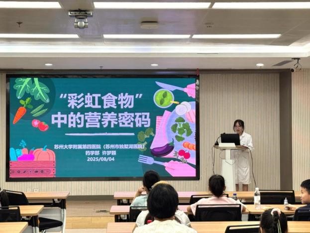 活动由药学部精心准备的儿童营养讲座及香包制作环节拉开帷幕。许梦颖老师以“‘彩虹食物’中的营养密码”为主题,深入浅出地讲解了儿童营养知识,从食物多样化的重要性,到谷类、蔬果、奶类等各类食物对孩子成长的关键作用,为家长和孩子们上了一堂生动的营养科普课。随后的香包制作环节充满了传统与趣味的文化氛围。在专业人员的指导下,孩子们亲自动手,挑选中药材、填充香囊,感受着传统中医药文化的独特魅力。