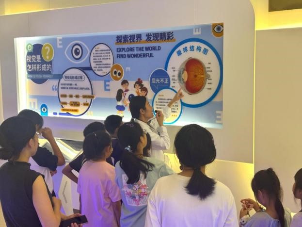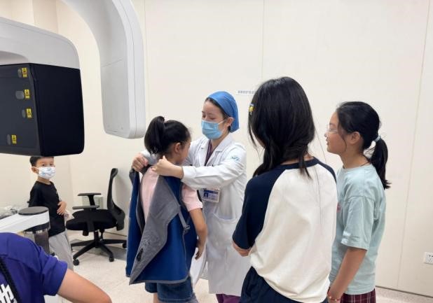 讲座与香包制作结束后,孩子们先后走进药学部、放射科、临床检测中心以及眼科教育基地参观。在各个科室,医护人员为孩子们热情地讲解着科室的工作内容、先进设备的用途以及相关医疗知识。药房里,孩子们认识了解药品的分类、储存和发放过程;放射科里,孩子们好奇地观察着大型影像设备,听医生讲解如何通过这些设备为患者诊断病情;临检中心内,孩子们近距离观察了各类样本的检测过程,对疾病的诊断有了更直观的认识;眼科教育基地体验趣味互动,孩子们学习到了保护眼睛的重要知识以及常见眼科疾病的防治方法。