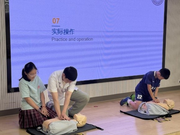 参观环节后,骨科青年医师卞梦轩带来了急救知识科普讲座。卞老师通过现场演示、模拟操作等方式,详细地向孩子们传授了海姆立克急救法、心肺复苏和AED的操作要领。孩子们积极参与互动,纷纷上台尝试,在实践中掌握了重要的急救技能。