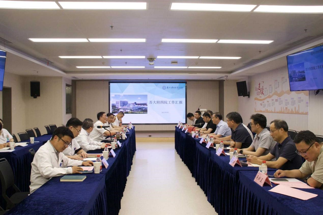 9月3日下午,苏州大学党委常委、副校长张正彪带队到苏州大学附属第四医院开展专题调研,旨在深化校院合作,协同推动科研工作高质量发展,为医院的三甲创建工作提供支持。苏大附四院党委书记侯建全,党委副书记、院长方琪,副院长周亚峰,党政办公室主任傅强,科教处处长江淼,药学部主任包健安,创新转化平台负责人周鹏等相关人员参加调研。