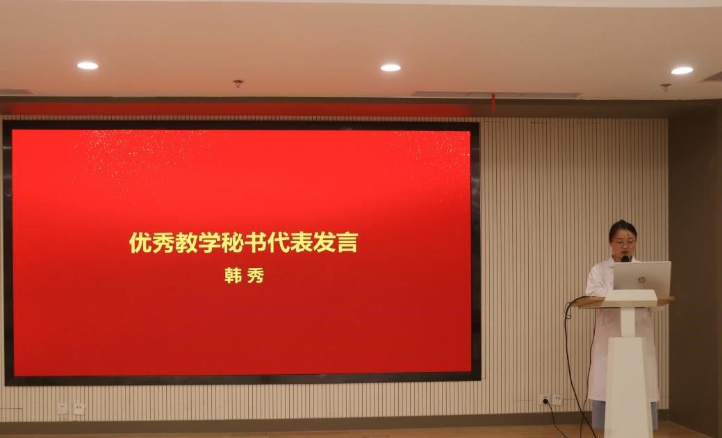 优秀教学秘书代表韩秀则从教学管理工作出发,讲述了该如何做好教学服务保障、搭建师生沟通桥梁。她表示未来将进一步提升工作效率与质量,为医院教学工作保驾护航。