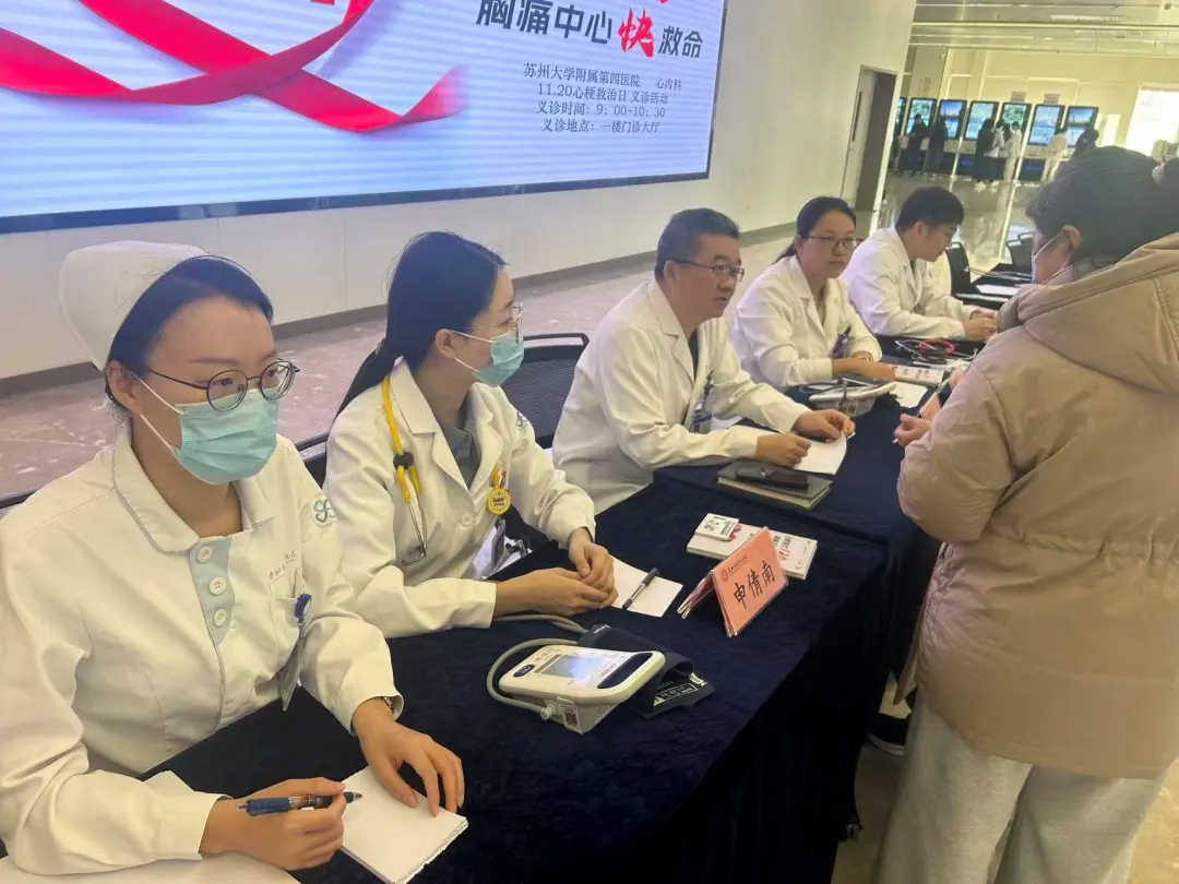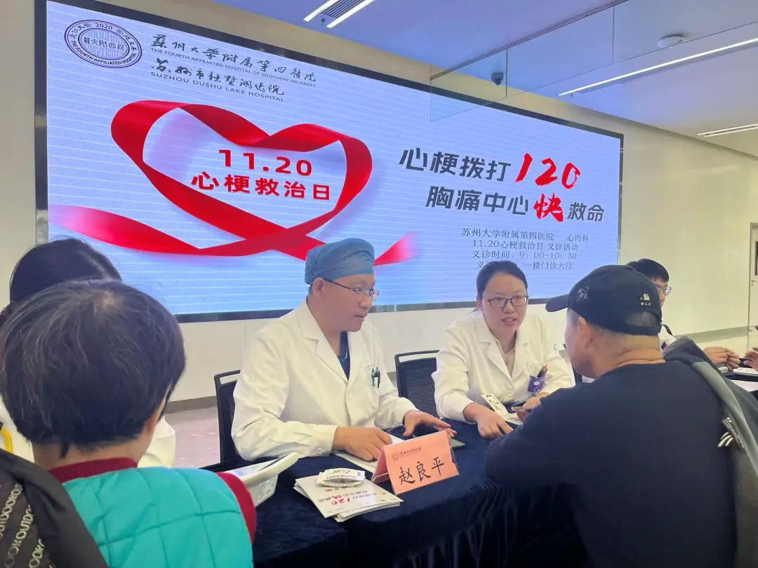 11月20日上午,在苏大附四院副院长周亚峰和心内科赵良平主任医师的带领下,在医院一楼门诊大厅开展了“11.20心梗救治日”义诊活动。