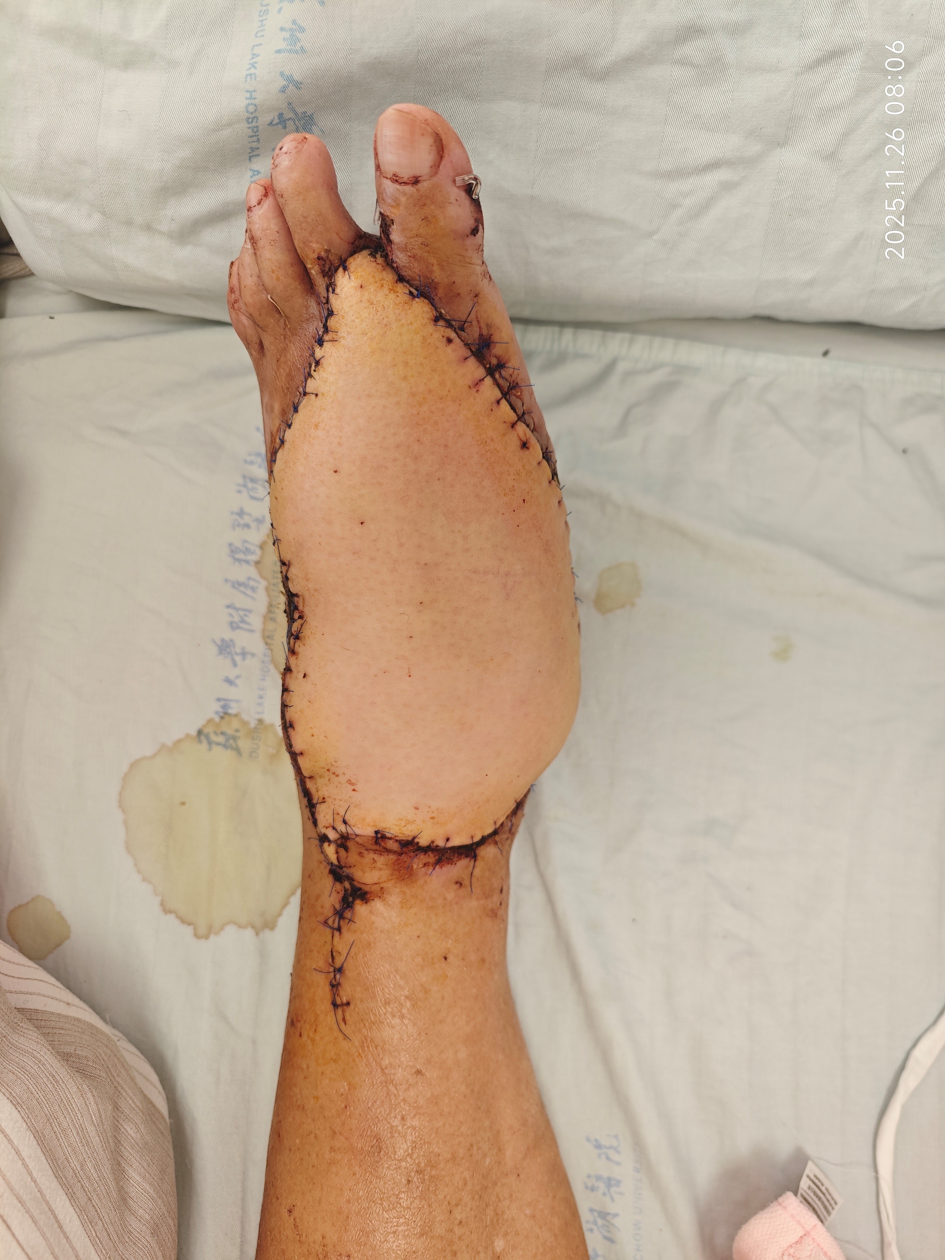 第一例手术,患者为73岁男性,团队为其实施高龄游离股前外侧皮瓣修复术。患者术前CTA提示血管硬化显著,患侧血管显影远差于健侧,血管条件的先天不足不仅大幅提升了显微吻合的操作难度,更让术中血流调控、术后抗痉挛抗凝护理充满不确定性,每一步都考验着团队的精准把控力。手术团队针对患者血管条件受限的特点,精确设计皮瓣,术中通过显微技术完成血管及神经吻合,并实时监控血流变化。术后团队对患者进行抗痉挛、抗凝及循环改善护理,皮瓣血运稳定,无感染或坏死迹象,患者恢复顺利,功能及外观得到良好改善。
