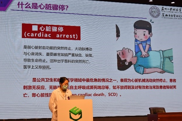 课程中,段洋副主任医师和崔宇睫医师先后向师生们阐述了心源性猝死的严重性以及“黄金四分钟”急救的重要性。随后,通过图文并茂的讲解,系统介绍了心肺复苏的基本原理、操作要领、AED的使用方法以及规范操作对提高抢救成功率的关键作用。通俗易懂的语言和贴近生活的实例,让师生们深刻认识到掌握急救技能的必要性。